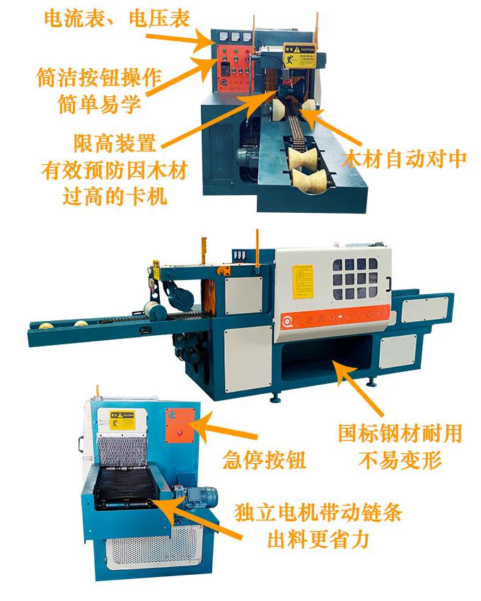 送 料:采用四排尖齒鏈條輸送,機上配有領先的變頻智能調速器,可以對大小木料的進料速度實行自由調速。原木可以實現自動分中,機上還配有限位開關,防止超去規格木料進入,防止卡木避免對機器造成損壞。