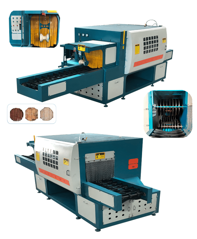 送 料:采用優質鏈條輸送,機上配有的變頻智能調速器,可以對大小木料的進料速度實行自由調速。原木可以實現自動分中,機上還配有限位開關,防止超去規格木料進入,防止卡木避免對機器造成損壞。