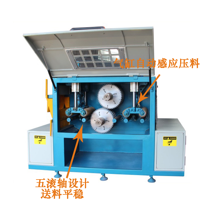 5.采用上下軸鋸設(shè)計(jì),具有鋸片直徑小,鋸路小省料的優(yōu)點(diǎn)。上下鋸設(shè)計(jì)的鋸片鋸路是正常單軸鋸片鋸路的50%。加工同樣高度的木料其鋸路僅為普通單據(jù)軸的1/2。鋸切面光滑平整可以代替刨。節(jié)能降耗一次多片加工。送料速度高,大大提高加工效率,上料快,操作簡單,維護(hù)保養(yǎng)簡單,上下輥主氣缸壓力,送料平穩(wěn),增加鋸片的使用壽命。