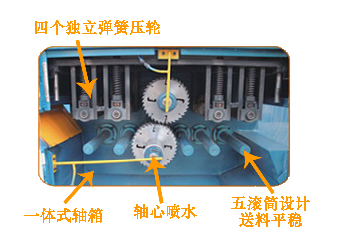 2.上壓料裝置采用四個獨立彈簧壓輪,同時具有容易調(diào)節(jié)加工厚度,運行穩(wěn)定,故障率低的優(yōu)點。