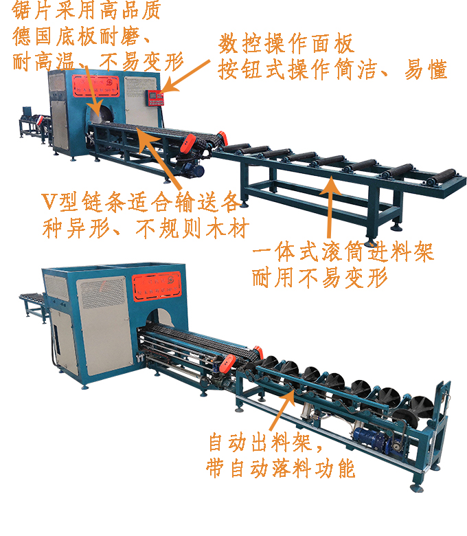 全自動數控斷料鋸是一種用于截斷圓木的專用機械,可取代傳統的斷木設備。本機是左右鋸設計,采用手自一體的液壓驅動,PLC數字控制系統,只需一名普通工人便可輕松操控,穩定性高,加工表面平整光潔,公差在2MM之內,截斷范圍可以隨意調節。加工長度和速度均可根據實際所需規格隨意調節,效率高,是傳統截斷機的2-5倍。鋸片配進口合金鋸片,使用壽命長.適用于原生木材,板材板方的切斷加工.本設備采用輸送臺自動進料,自動感應壓料,自動截斷,輸送臺自動出料等先進裝備,具有操作簡單,安全,效率快,切斷長短可隨意設定,省時省工,大大減輕操作者勞動強度等優點.