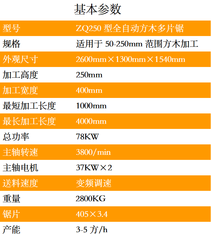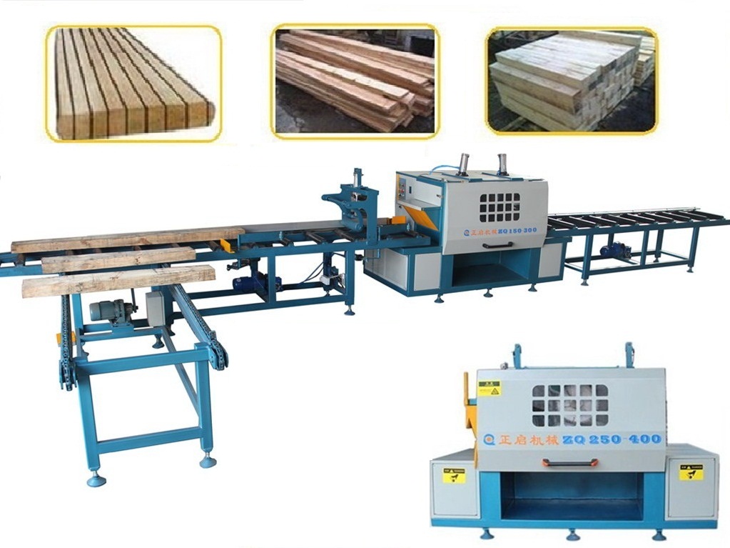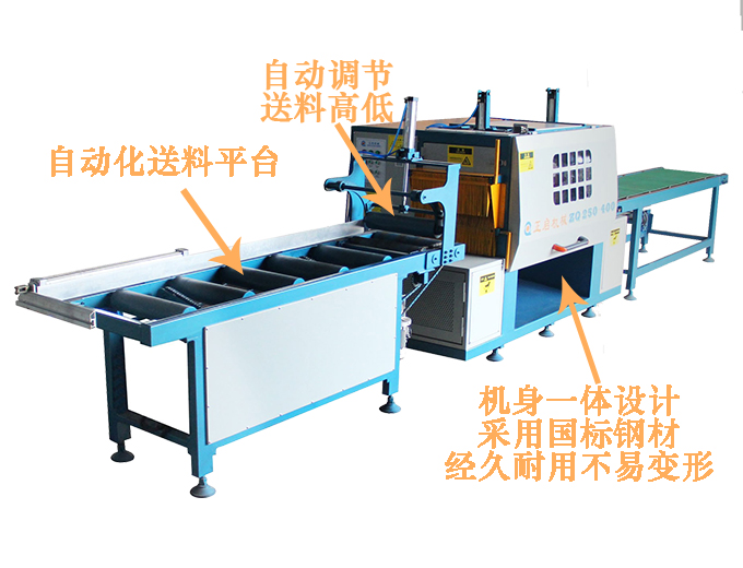 ZQ250型全自動方木多片鋸具有自動感應調節進料高低尺寸,全自動化輔助送料工作臺,工作臺具有自動靠邊、對中、進料等先進功能,可大幅度減少操作人員的數量,亦可大大減少操作工的勞動強度。上軸采用氣缸自動感應壓料裝置,可實現大小方料隨意放,無需調高低,送料平穩速度高,操作和維護保養簡單。上下軸的設計,具有鋸片直徑小,鋸路小省料的優點,鋸面光滑平整可以代替刨,適用于大方料、長木料的開方開片、實木規格板、建筑模方、實木地板、實木家具等木材加工企業。在國內東北地區、內蒙古滿洲里,國外俄羅斯、非洲安哥拉、津巴布韋、剛果、南美巴拿馬、中美哥斯達黎加等地區廣泛使用。